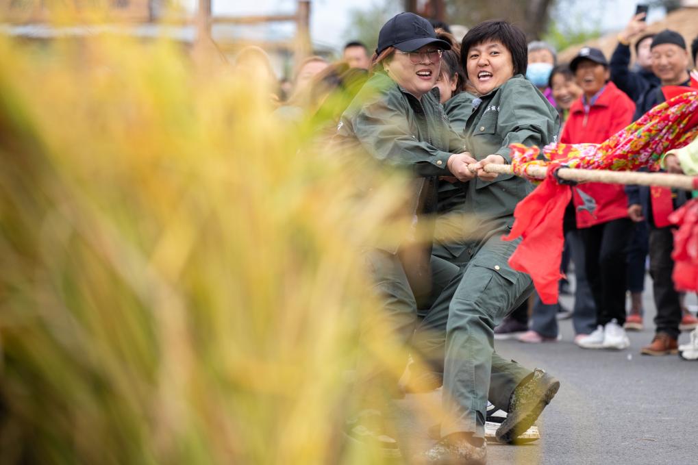 9月20日,在寧安市上官地村第七屆豐收節現場,陳雨佳和村民一起參加拔河比賽。