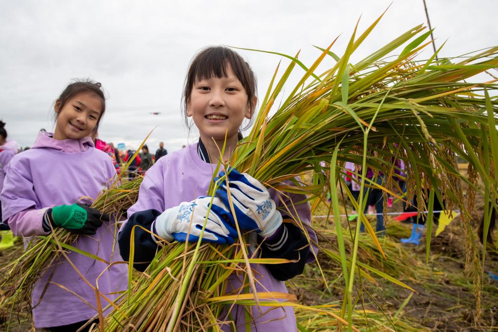 9月20日,在寧安市上官地村第七屆豐收節現場,孩子們展示自己收割的水稻。
