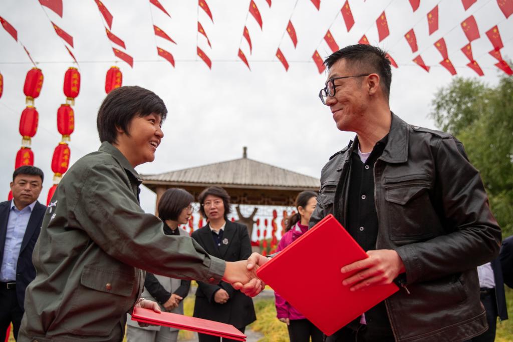 9月20日,在寧安市上官地村第七屆豐收節現場,陳雨佳和村民一起慶祝開鐮。