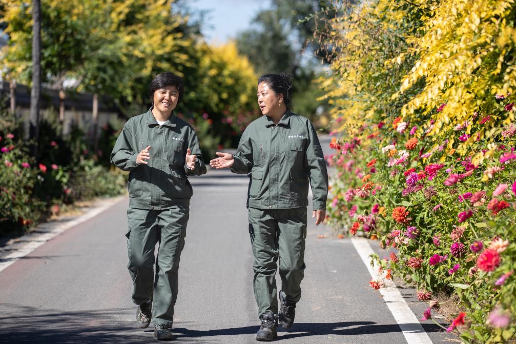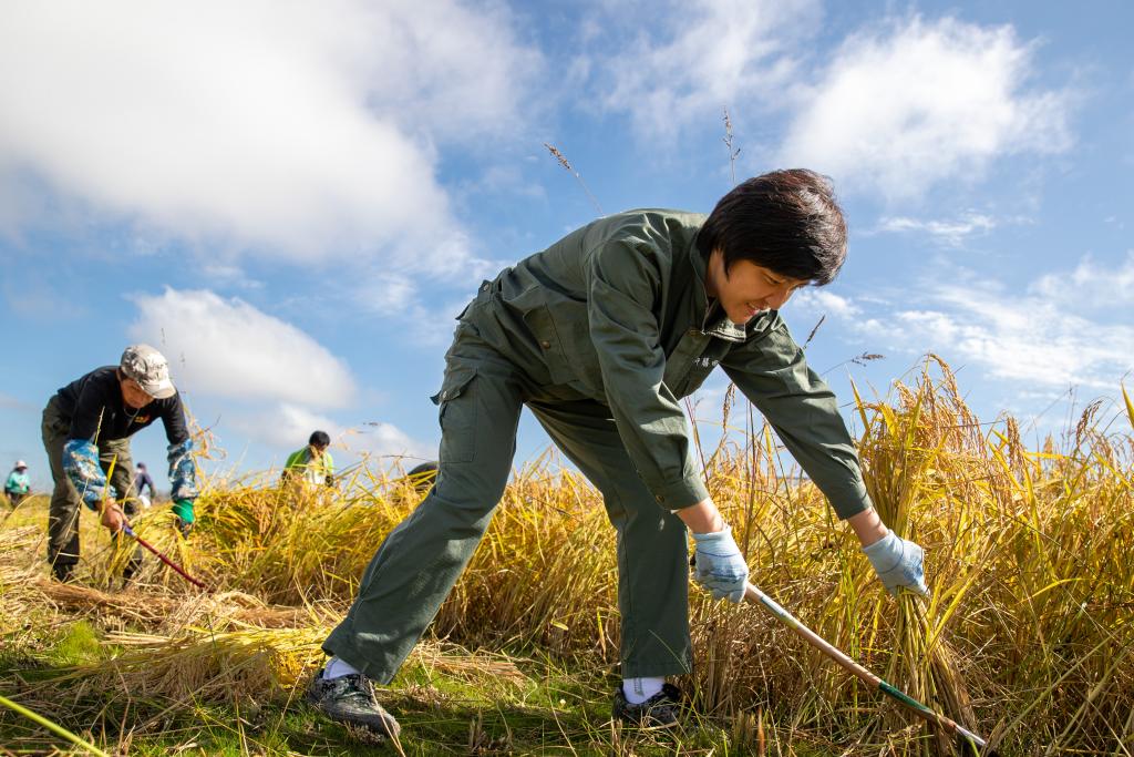 9月21日,在寧安市上官地村,陳雨佳和村民一起收割水稻。