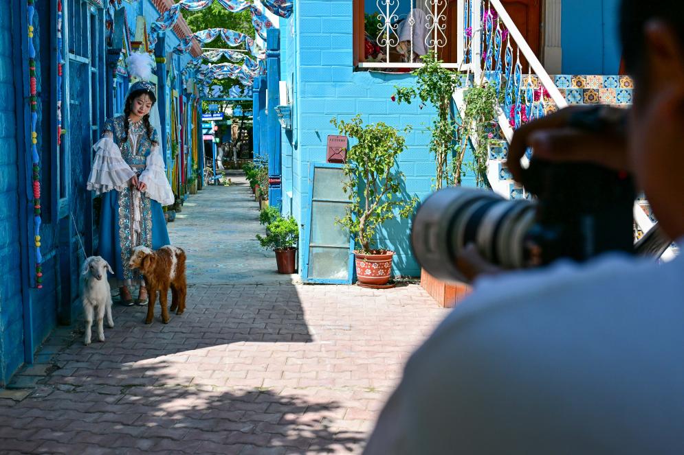 游客在新疆伊犁哈薩克自治州伊寧市喀贊其民俗旅游區打卡拍照(5月11日攝)。新華社記者 丁磊 攝