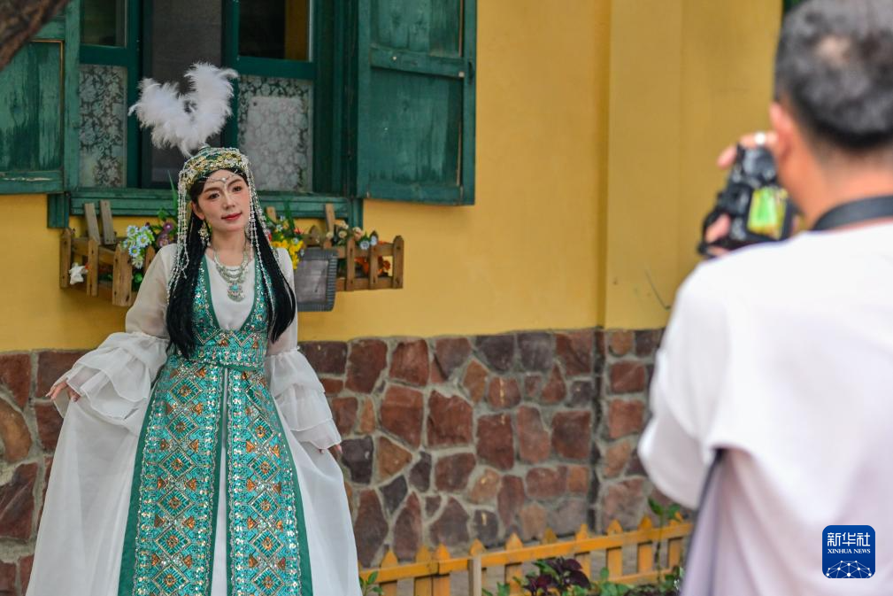 在新疆伊犁哈薩克自治州伊寧市六星街,游客體驗旅拍項目(7月28日攝)。新華社記者 丁磊 攝