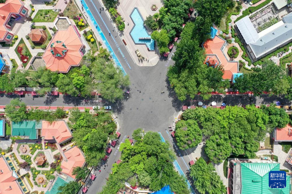 這是在新疆伊犁哈薩克自治州伊寧市拍攝的六星街景區中心廣場(5月12日攝,無人機照片)。新華社記者 丁磊 攝