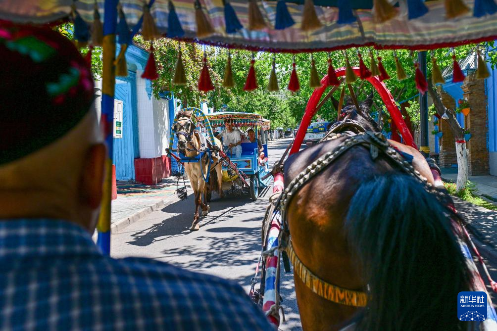 在新疆伊犁哈薩克自治州伊寧市喀贊其民俗旅游區,游客坐著馬車觀光游覽(7月27日攝)。新華社記者 丁磊 攝