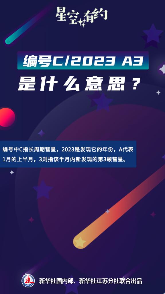 C/2023 A3(Tsuchinshan-ATLAS)于2023年1月9日被中國科學院紫金山天文臺近地天體望遠鏡首次觀測到,這也是紫金山天文臺發現的第8顆彗星。它的編號中蘊藏著“發現密碼”:C指長周期彗星,2023是發現它的年份,A代表1月的上半月,3則指該半月內新發現的第3顆彗星。當時,該目標亮度約為19星等,視運動速度為0.069度/天。