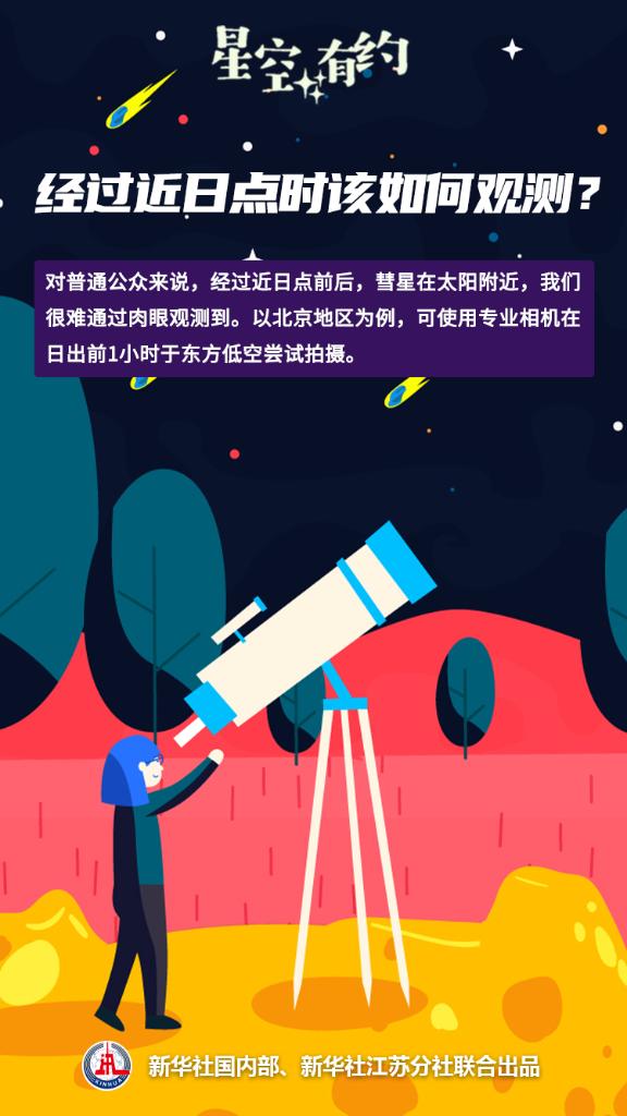 中國科學院紫金山天文臺科普主管王科超介紹,根據目前的觀測和預測,這顆彗星在9月中旬視星等已達到4等左右,正朝著近日點方向運動,預計將于北京時間9月28日凌晨經過近日點,屆時與太陽的距離為0.39個天文單位、角距離約為23度,預計亮度在2.7等左右?!敖涍^近日點前后,彗星在太陽附近,我們很難通過肉眼觀測到。以北京地區為例,感興趣的公眾可使用專業相機在日出前1小時于東方低空嘗試拍攝?!?/p>