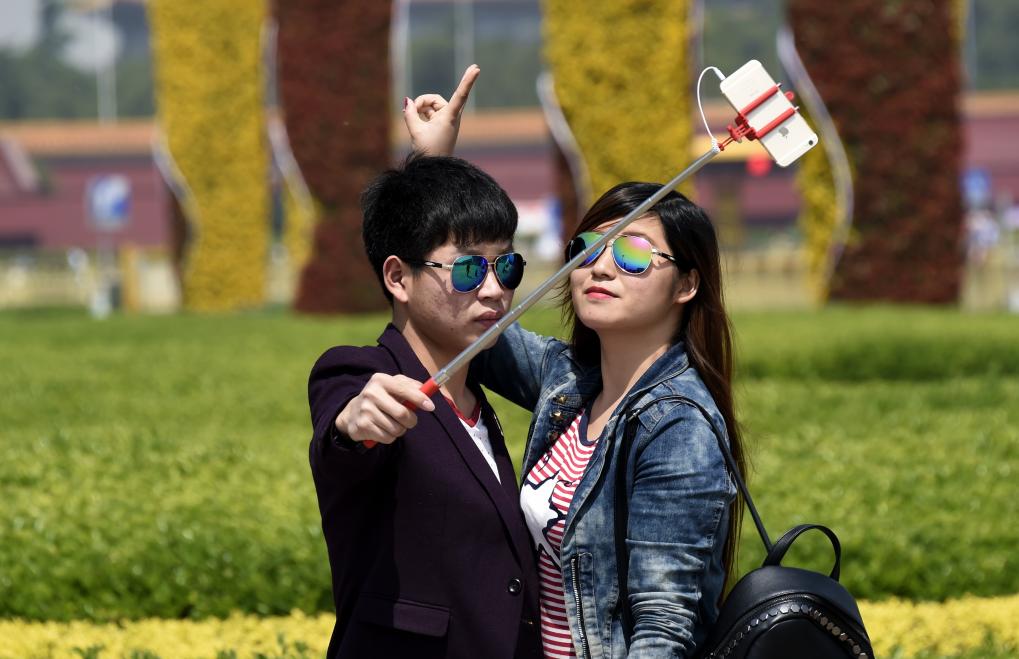 2016年“五一”國際勞動節前夕,游客在天安門廣場花壇前留影。 新華社記者 李欣 攝