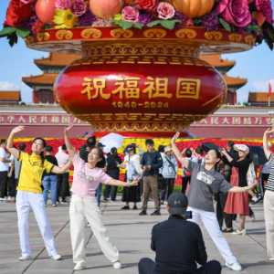 2024年9月25日,“祝福祖國”巨型花籃亮相北京天安門廣場,人們在花籃南側留影。 新華社記者 陳鐘昊 攝
