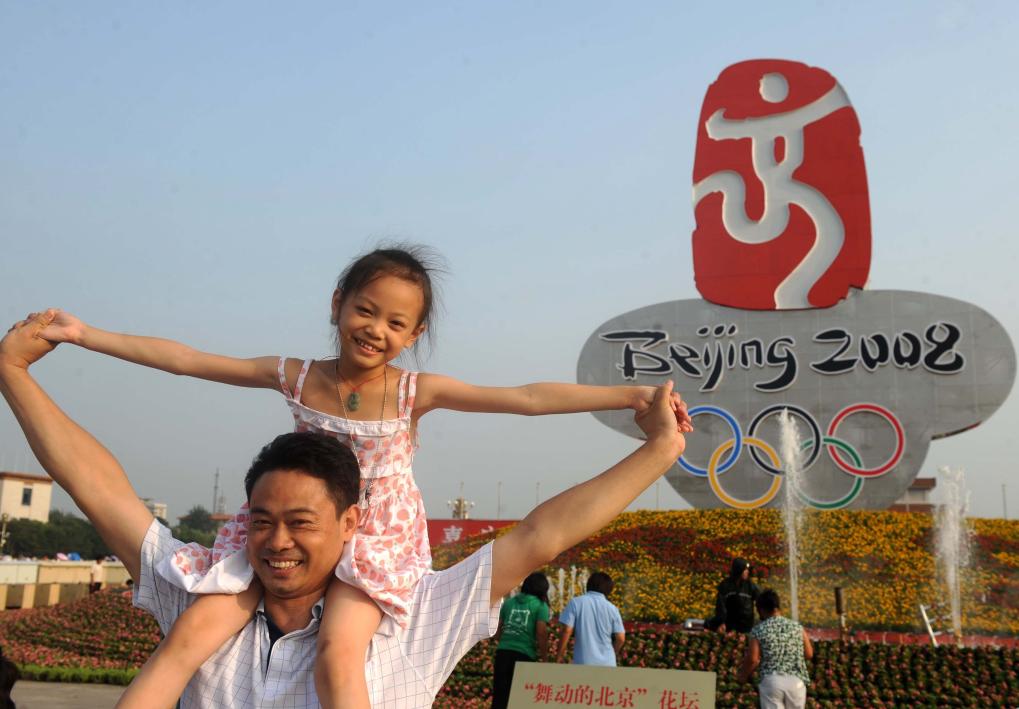 2008年7月29日,從深圳來北京旅游的一對父女在天安門廣場留影。當日,距北京奧運會開幕還有10天。新華社記者 羅曉光 攝