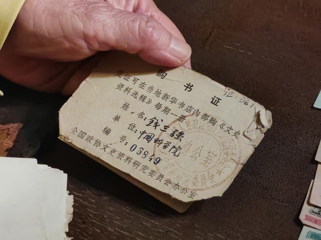 錢民協向記者展示錢三強的購書證。新華社記者宋晨 攝