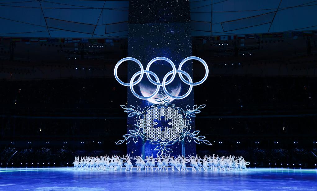 這是2022年2月4日晚在北京國家體育場舉行的第二十四屆冬季奧林匹克運動會開幕式上的“構建一朵雪花”環節。新華社記者 曹燦 攝
