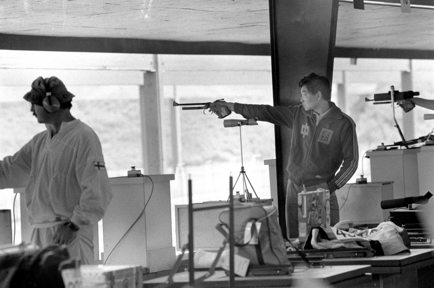 1984年7月29日,中國運動員許海峰(右)在奧運會男子自選手槍射擊比賽中。許海峰以566環的成績獲得這個項目的冠軍,奪得本屆奧運會的第一枚金牌。新華社記者 官天一 攝(傳真照片)