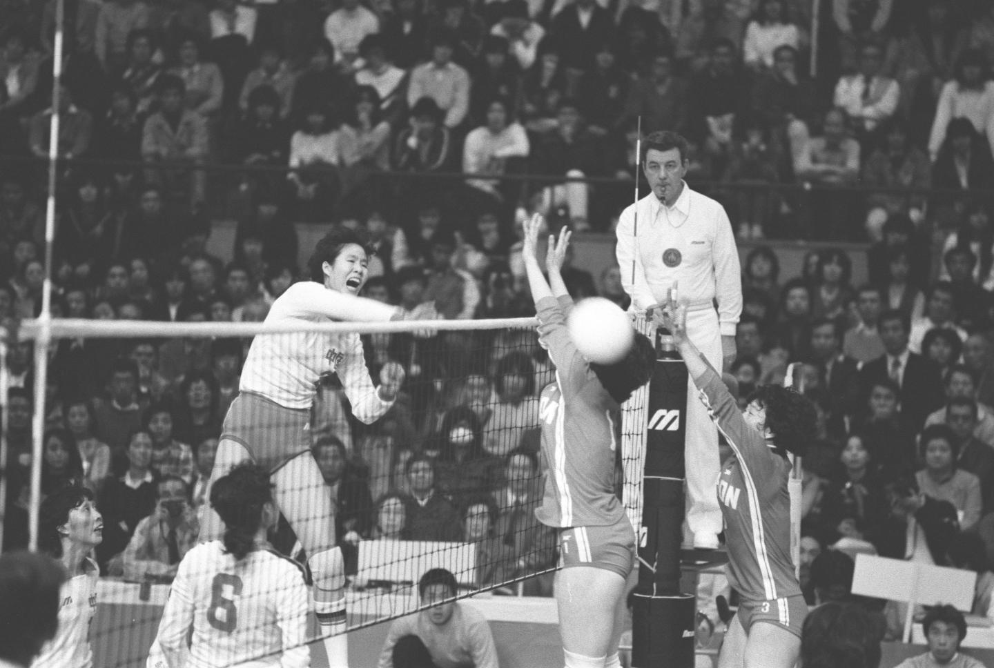 1981年11月16日,在日本大阪,中國隊以3:2戰勝日本女排,奪得第三屆世界杯女子排球賽冠軍。這是郎平在扣球。黎啟榕 攝(新華社稿)