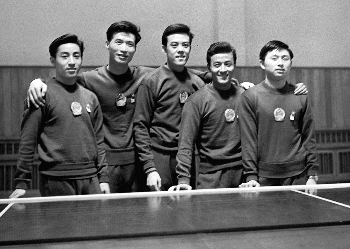 1961年4月9日,中國男子乒乓球隊榮獲第26屆世界乒乓球錦標賽男子團體冠軍。這是參加男子團體賽的5名中國選手合影。自左至右:莊則棟、王傳耀、容國團、李富榮、徐寅生。新華社記者 張家驊 攝
