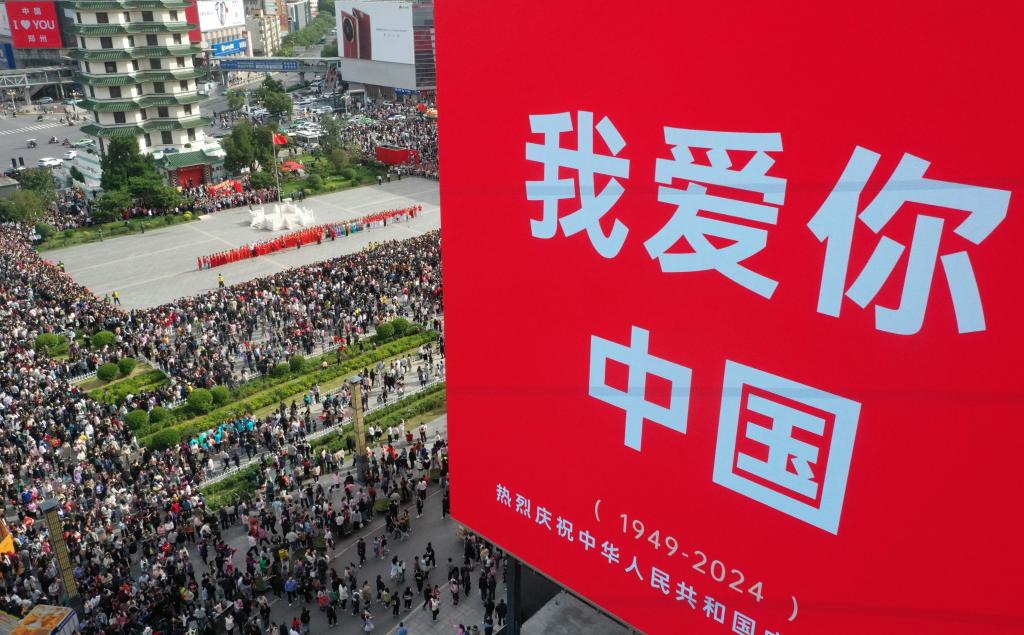 2024年10月1日,人們在河南省鄭州市二七廣場觀看升旗儀式后的演出(無人機照片)。新華社記者 李嘉南 攝