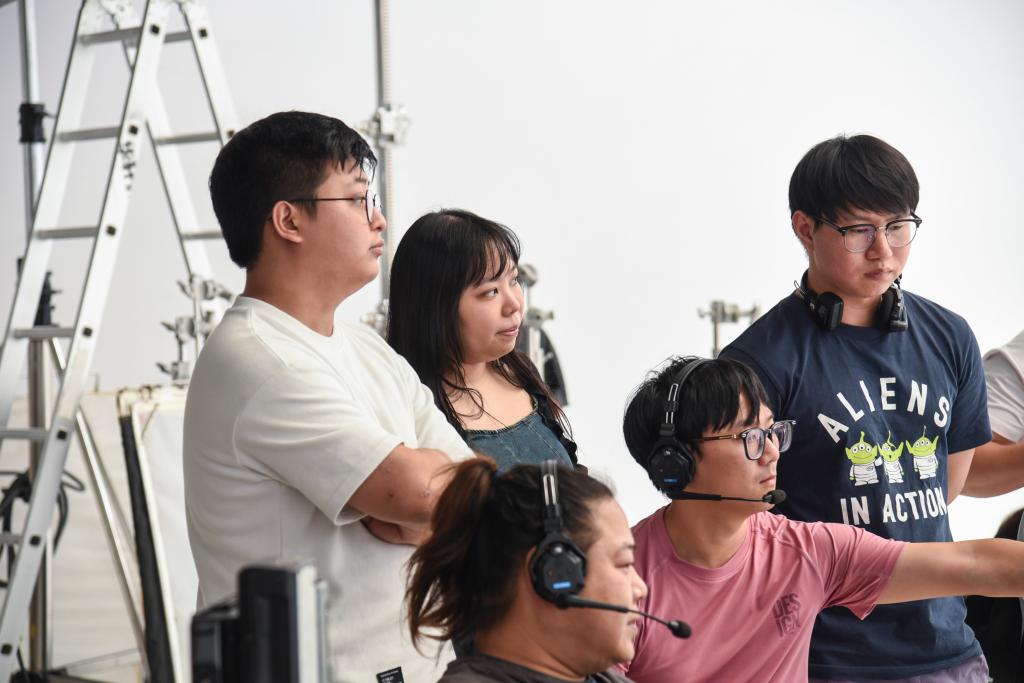胥力(左一)和黃詩茵(左二)在廣州的一間錄影棚內和同事趕制宣傳視頻(9月29日攝)。 新華社記者 洪澤華 攝