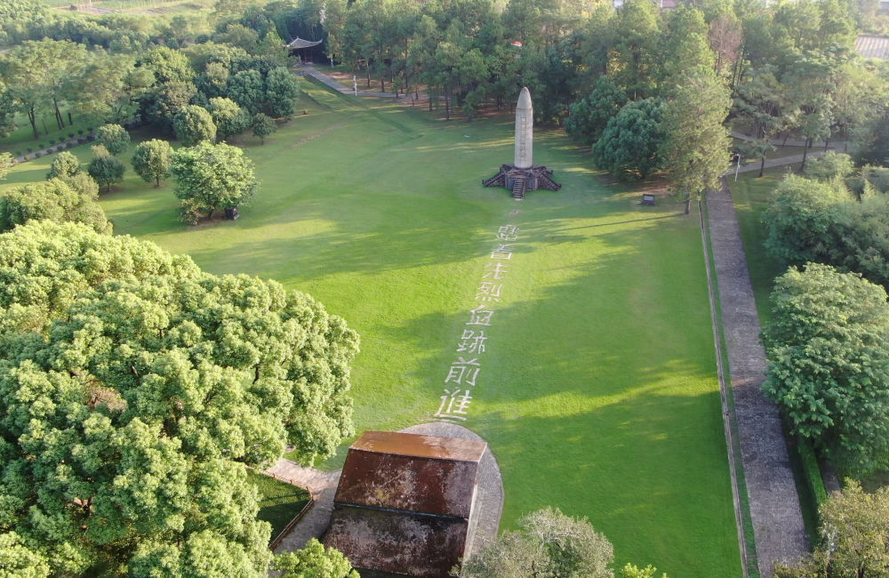 江西省瑞金市葉坪紅軍廣場,瑞金紅軍烈士紀念塔巍然聳立,地面上有“踏著先烈血跡前進”八個遒勁大字(2024年9月11日攝,無人機照片)。新華社記者 余剛 攝