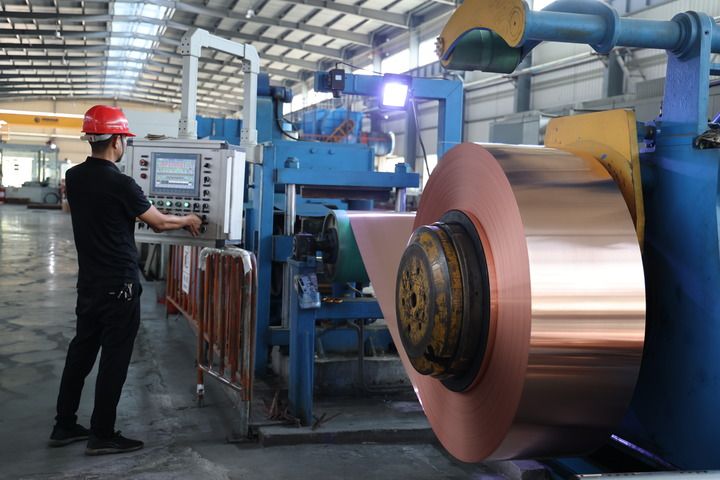 江西金拉銅箔有限公司車間工人在操作生產設備,這家公司2024年獲評國家級專精特新“小巨人”企業(2024年9月14日攝)。新華社發(鄧浩亭 攝)