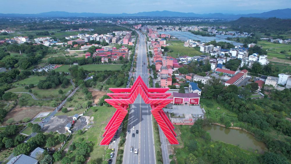 位于江西省瑞金市葉坪革命舊址群附近的“勝利之門”雕塑(2024年10月2日攝,無人機照片)。新華社發(鄧浩亭 攝)