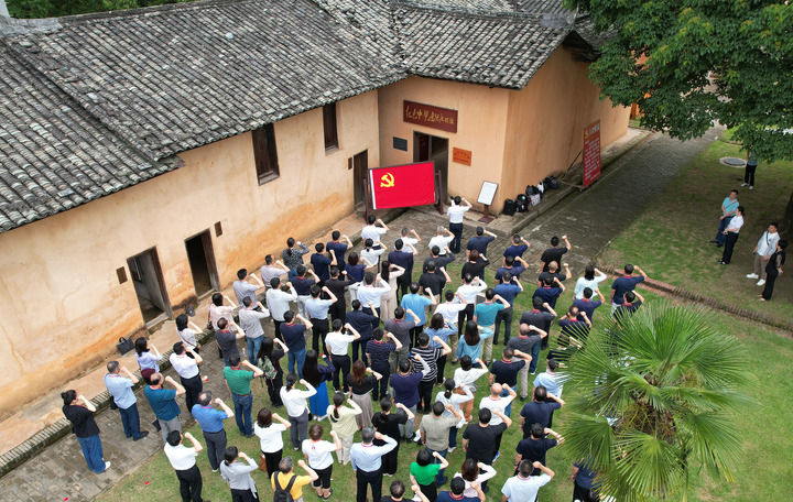 參觀者在江西省瑞金市葉坪革命舊址參加活動(2024年5月30日攝,無人機照片)。新華社記者 萬象 攝
