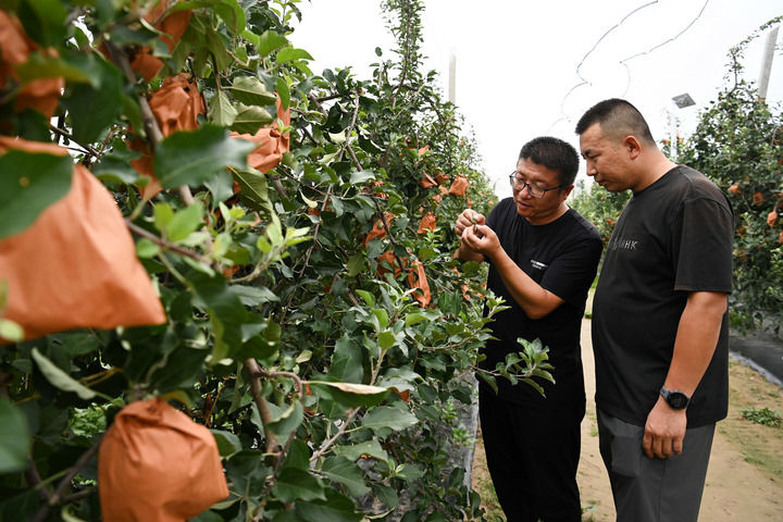 延安市安塞區果業技術推廣中心主任張剛(左)在果園觀察果樹長勢(2024年8月8日攝)。新華社記者 鄒競一 攝