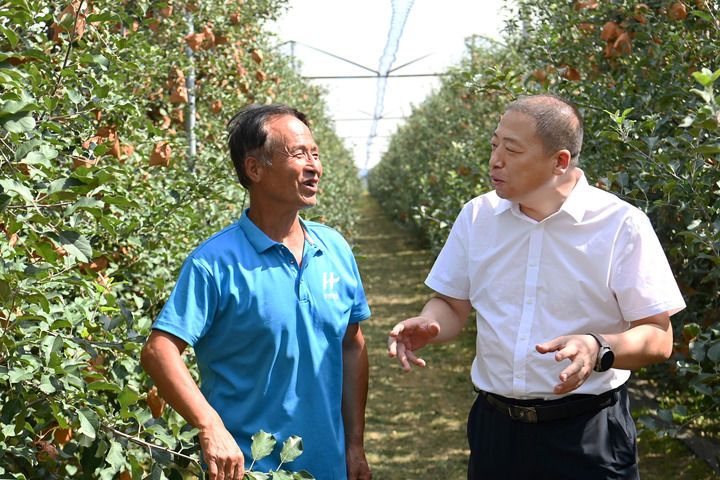 延安市洛川縣槐柏鎮黨委書記解賀宏(右)在果園與果農交流(2024年8月5日攝)。新華社記者 鄒競一 攝