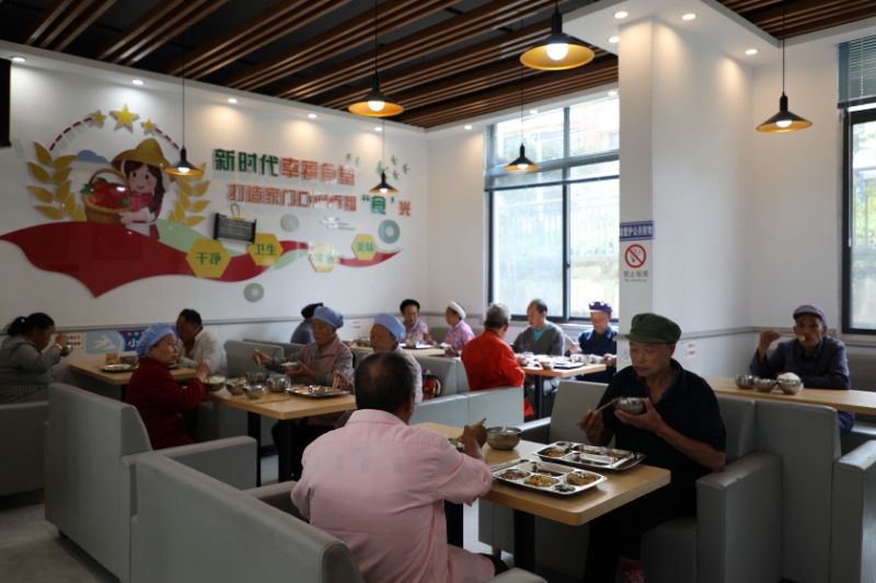 老人們在云南省昭通市永善縣溪洛渡街道紅光社區幸福餐廳用餐。(楊亞莉 攝)