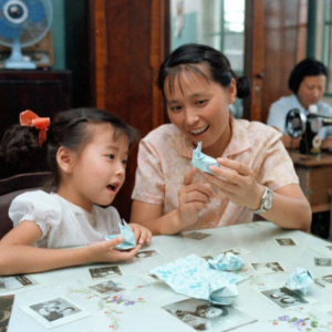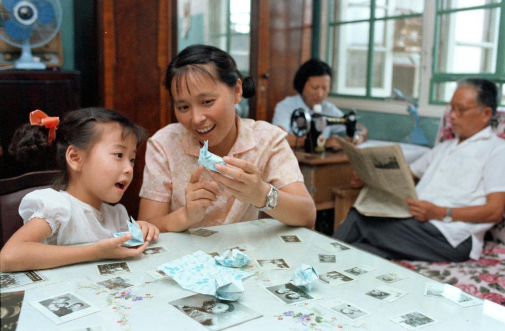 1980年,上海閔行中學教師殷學雷(左二)在家中和女兒做折紙游戲。新華社記者 楊溥濤 攝