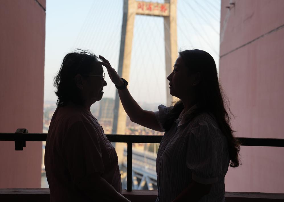 9月28日,馬赟幫媽媽殷學雷整理被風吹亂的頭發。