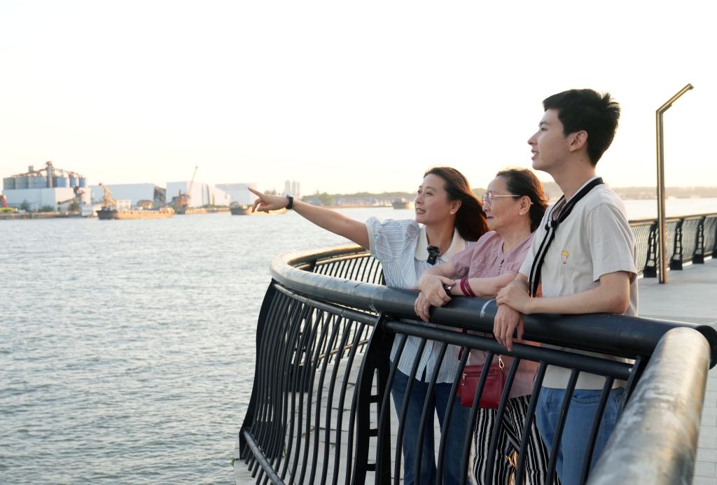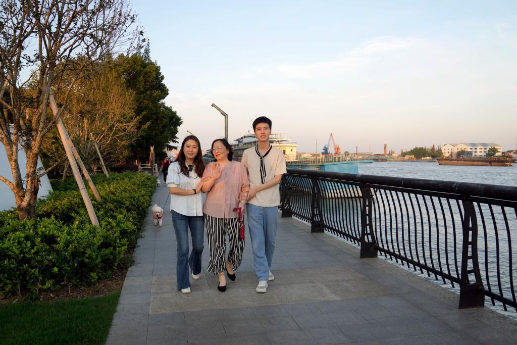 9月28日,殷學雷與女兒、外孫在上海閔行濱江步道散步觀景。