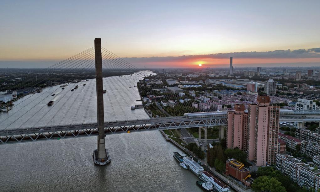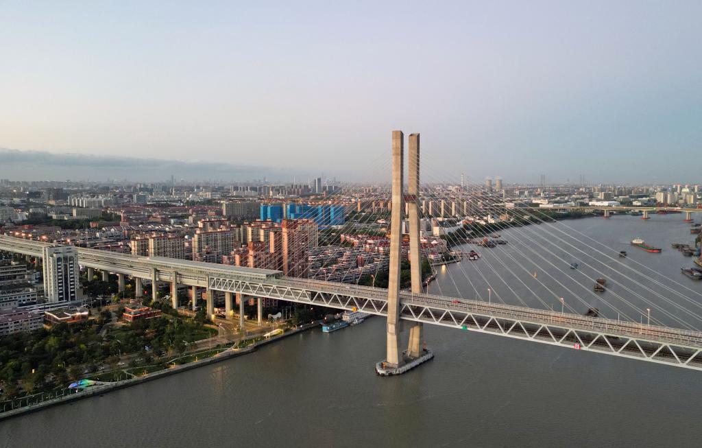 10月4日拍攝的上海閔行濱江與閔浦二橋(無人機照片)。