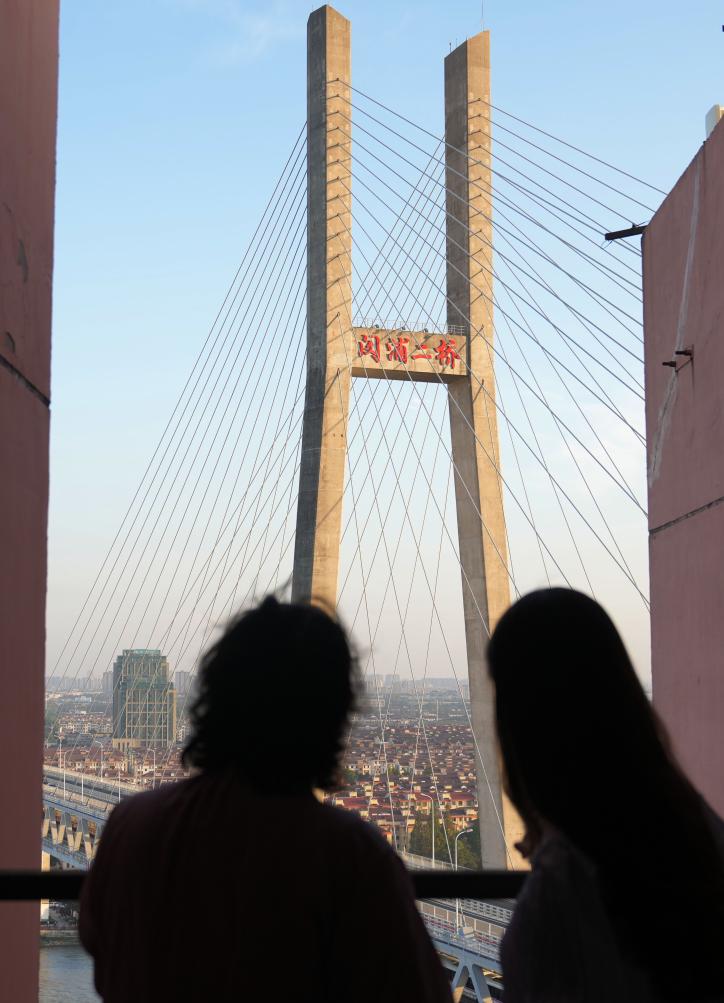 9月28日,殷學雷與女兒馬赟在自家樓房眺望閔浦二橋。