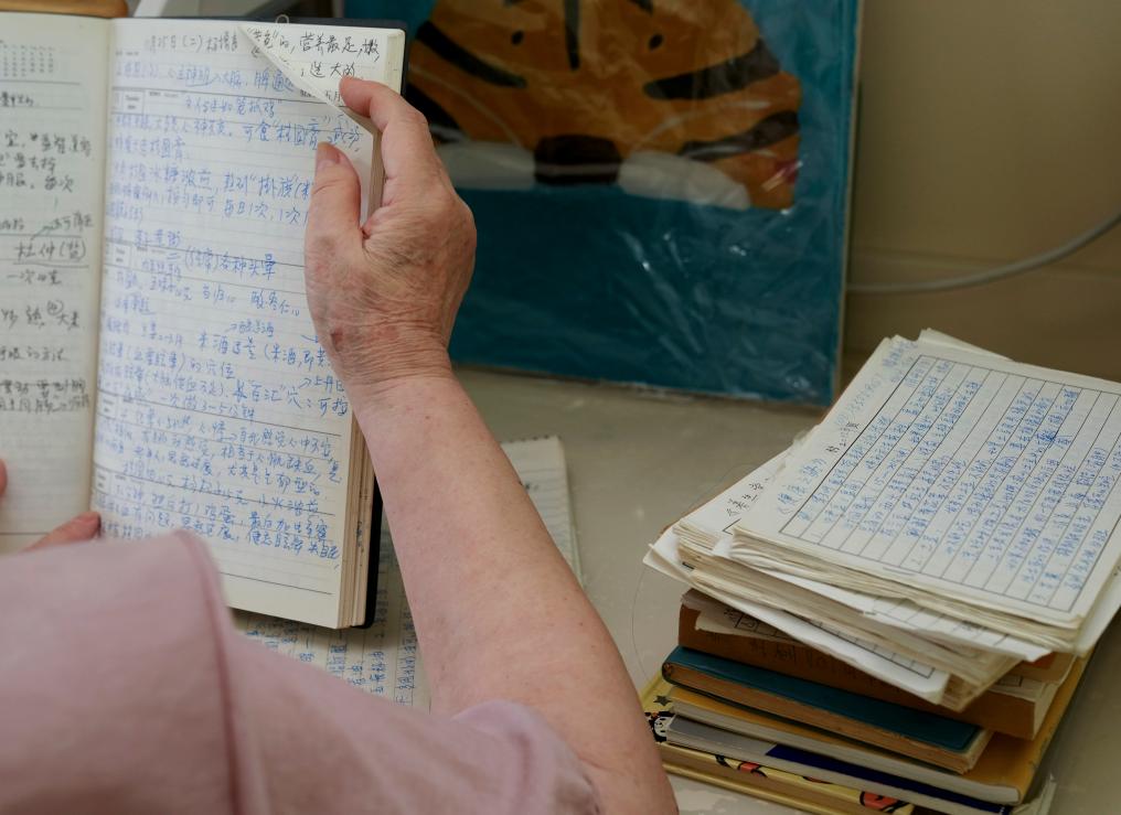 9月28日,殷學雷在家查看健康養生知識筆記。