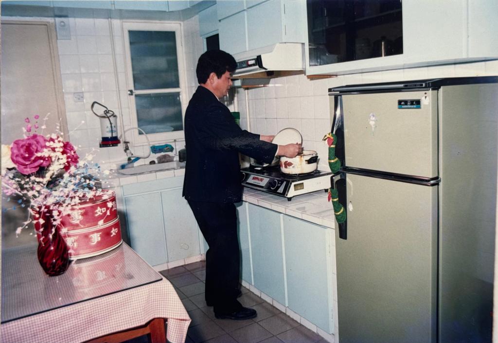 1992年,殷學雷的丈夫在新居的廚房燒飯。那一年喬遷新居后,他們家有了獨用的廚房和衛生間。新華社發(受訪者供圖)