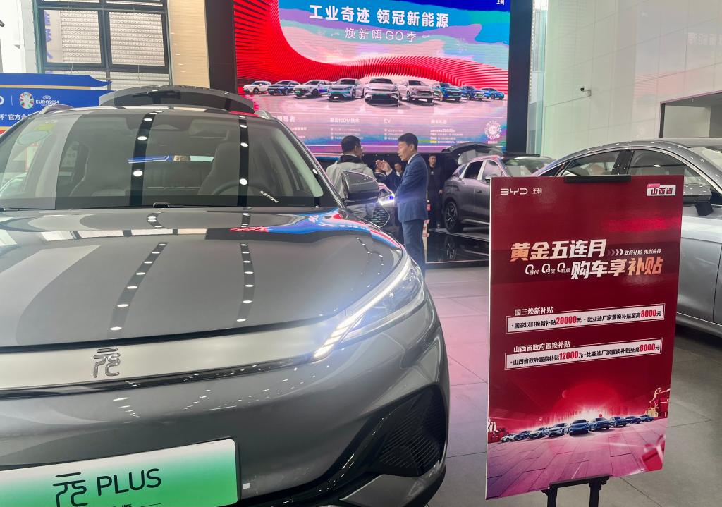 在太原武宿國際機場附近一家比亞迪汽車4S店,展廳內的熱門車型旁,銷售人員在詳細地解答著顧客的問題。