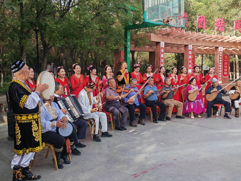 2024年9月19日,新疆庫爾勒市朝陽街道團結社區石榴籽樂團在為居民們表演。新華社記者 顧煜 攝