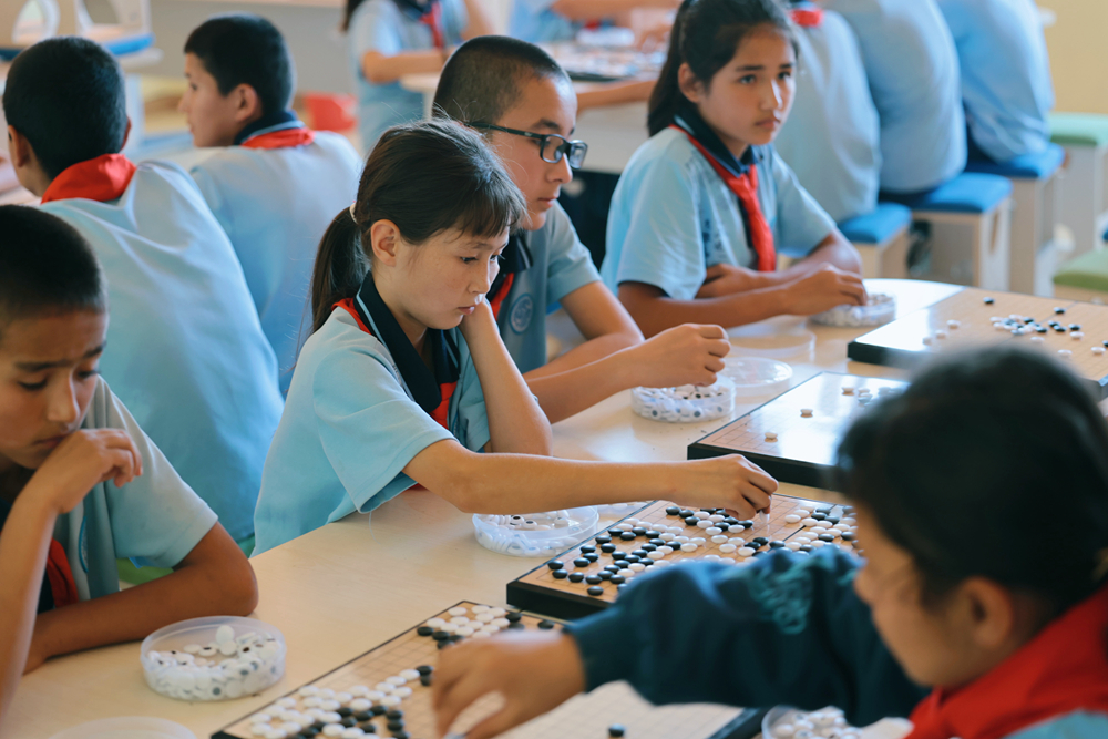 2024年9月23日,在新疆烏什縣依麻木鎮國家通用語言學校,學生們在下圍棋。新華社記者 任沁沁 攝