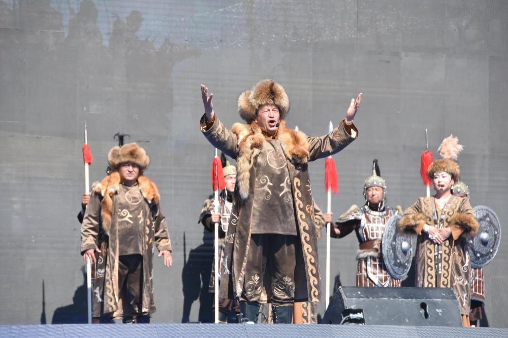 2023年7月13日,在新疆克孜勒蘇柯爾克孜自治州烏恰縣,歌舞演員在第九屆瑪納斯國際文化旅游節開幕式上表演《瑪納斯》片段。新華社記者 張瑜 攝