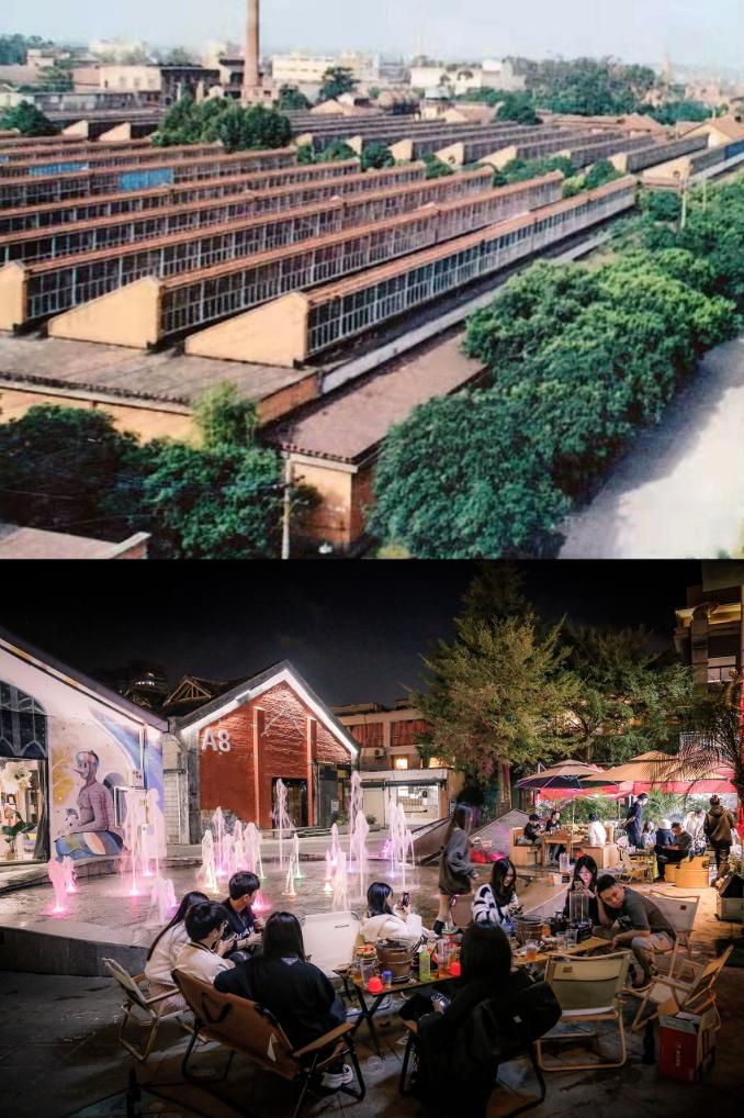拼版照片:上圖為原南寧市絹紡廠(資料圖片);下圖為經過改造后的百益上河城。