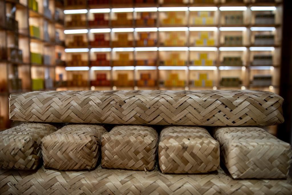 10月27日在四川省雅安市的雅安茶廠有限公司拍攝的裝有藏茶茶餅的竹條包裝,這種包裝方式至今保留。新華社記者 儲加音 攝
