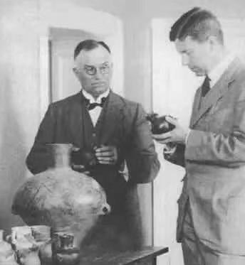 瑞典地質學家安特生(左)在研究彩陶。新華社發