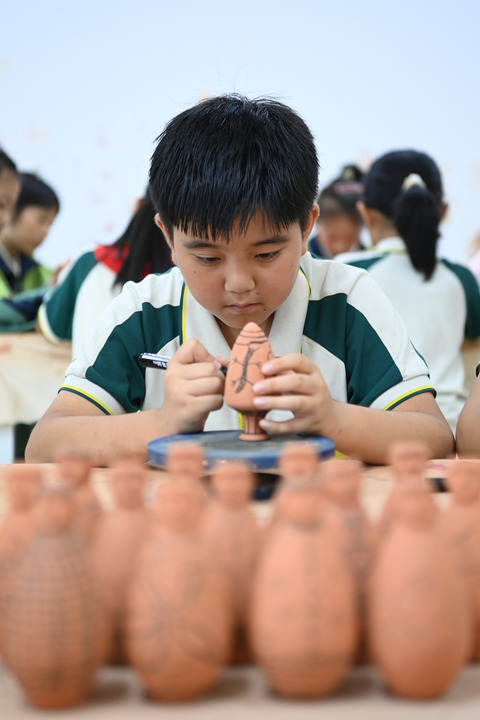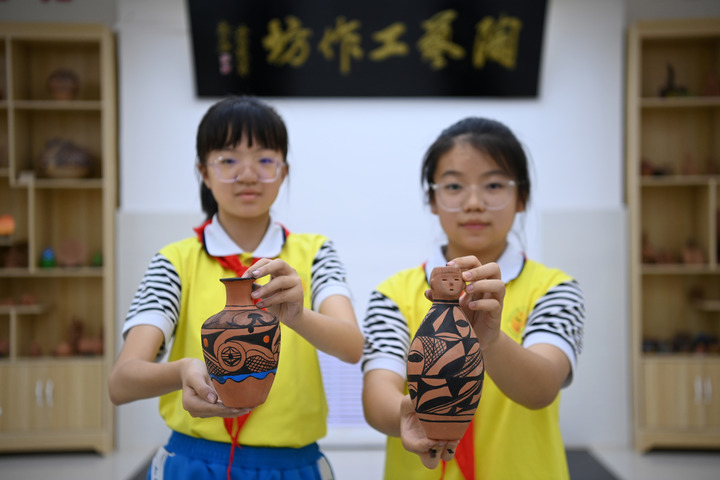 在臨洮縣第一實驗小學,陶藝社團的學生展示自己制作的彩陶作品。新華社記者 范培珅 攝