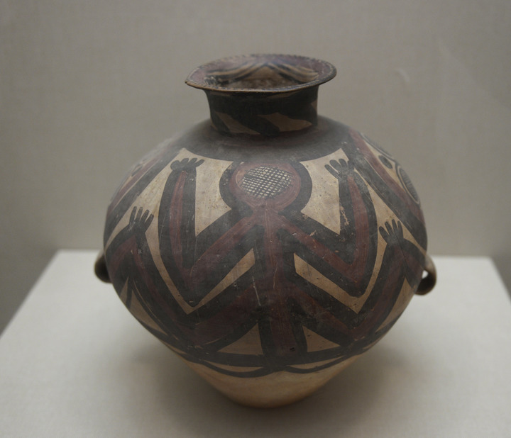 圖為馬家窯文化晚期的神人紋彩陶壺。新華社發(史有東攝)
