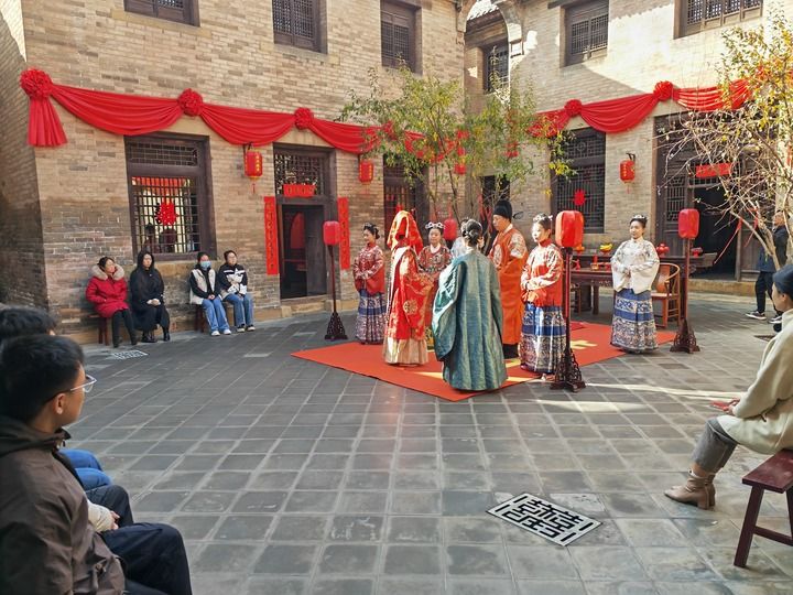 隨著演員齊聲吟誦,古院落中,一場明制出閣禮正在上演。不大的小院擠滿了觀禮游客,院外不少人沒擠進來,還在踮腳朝里望。這里是山西省高平市河西鎮的喜鎮蘇莊景區。