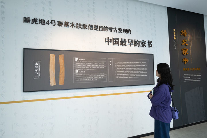 步入“簡牘圣地——云夢出土秦漢簡牘展”展廳,多項“之最”與“首次”在一張張老照片的映襯下,彰顯出云夢在考古史上與眾不同的地位。展廳內,呈現了云夢出土的睡虎地秦簡、木牘家書、龍崗秦簡、睡虎地漢簡、“中華第一長文觚”等珍貴文物,展示了秦、楚文化的逐漸融合,證實了云夢是楚秦漢嬗遞——秦漢帝國大一統進程的重要節點。