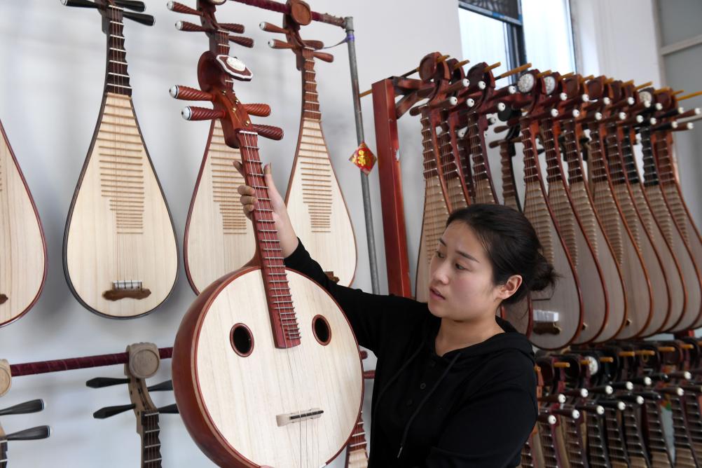 河南省開封市蘭考縣堌陽鎮徐場村村民孔釋漫在家庭樂器生產作坊工作(2024年4月17日攝)。新華社記者 朱祥 攝