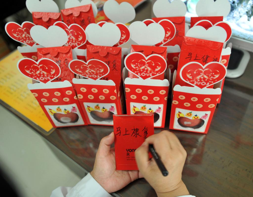 在廣西南寧市第四人民醫院艾滋病科,護士長杜麗群為住院病人準備新年祝?!靶《Y包”(2014年1月30日攝)。