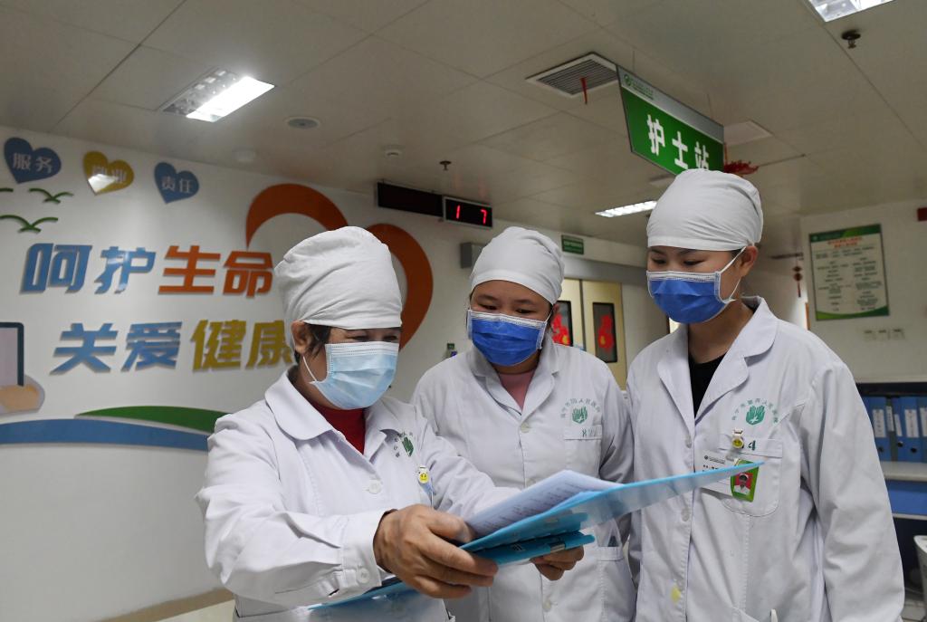 在南寧市第四人民醫院,吳明真在查看病人情況(2017年11月16日攝)。