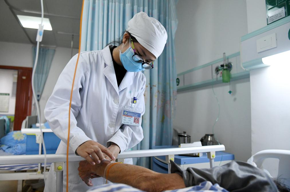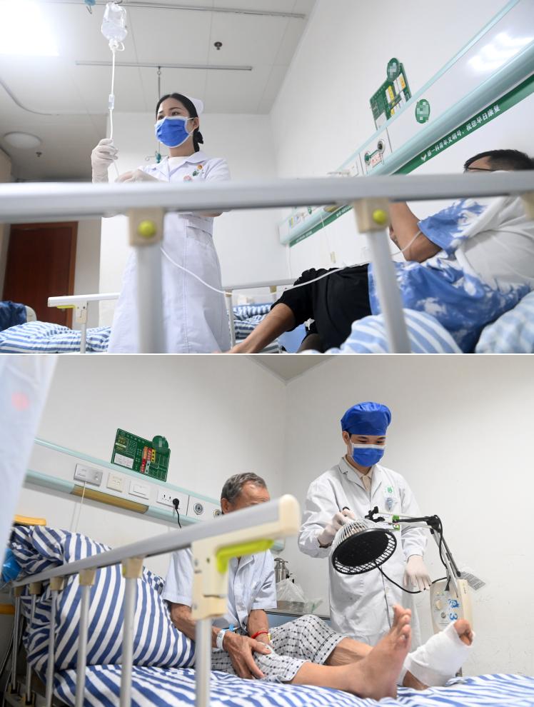 這是一張拼版照片。在南寧市第四人民醫院,吳雅靜(上圖)在給病人打點滴,楊江華(下圖)在護理病人(2024年5月11日攝)。