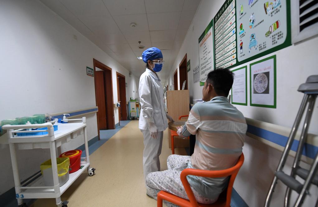 在南寧市第四人民醫院,黃小賢在病房區走廊和病人談心(2023年5月10日攝)。